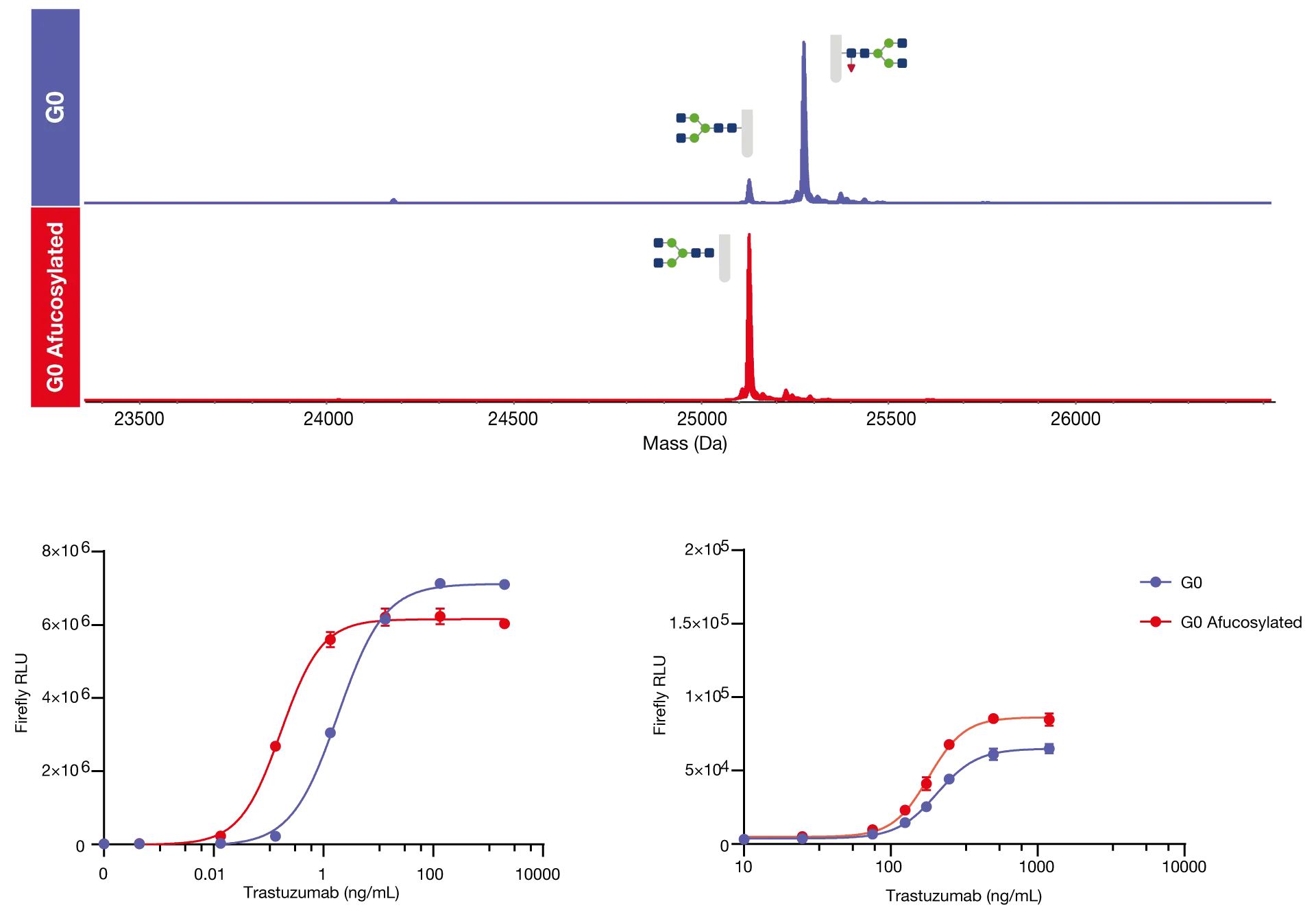 ADCC and ADCP functional assays (iLite®, SVAR) were carried out using the glycoengineered trastuzumab to determine the impact of core fucosylation on antibody effector function. In the ADCC reporter assay, we can see a clear shift to the left in the afucosylated antibody which indicates a clear and considerable increase in the ADCC potency, and in this instance, there was a calculated 10-fold decrease in EC50 following core afucosylation. In the ADCP assay we observe that there was not significant horizontal shift, which indicates that ADCP potency is similar between the two samples, however, the clear vertical shift that we observe following afucosylation indicates a considerable increase in ADCP efficacy