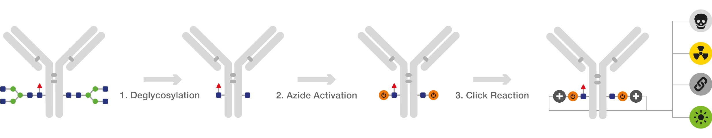 GlyCLICK is a three-step conjugation technology for site-specific and quantitative conjugation of IgG from several species and subclasses: